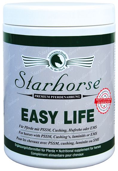 Starhorse Easy Life ist ein stärke- und zuckerfreies Ergänzungsfuttermittel, das speziell für Pferde mit PSSM, Cushing, Hufrehe oder EMS entwickelt worden ist. Für stoffwechselentgleiste Pferde passendes Futter zu finden, das möglichst frei von Stärke und Zucker ist und gleichzeitig alle wichtigen Nährstoffe enthält, stellt eine große Herausforderung dar. Aufgrund dieser Schwierigkeit ist eine zwangsläufige Unterversorgung in der Grundversorgung eine sehr häufige Folgeerscheinung. Ausgelöst werden Stoffwechselerkrankungen durch vererbte Veranlagung, Stress und Mängel an diversen Nährstoffen (meist Vitamin E und Selen). Mit Easy Life wurde von Starhorse ein Produkt kreiert, das hoch dosierte Nährstoffmengen - abgestimmt auf Pferde mit Stoffwechselproblemen – enthält und exakt den Fütterungsanforderungen von stoffwechselerkrankten Pferden entspricht.
