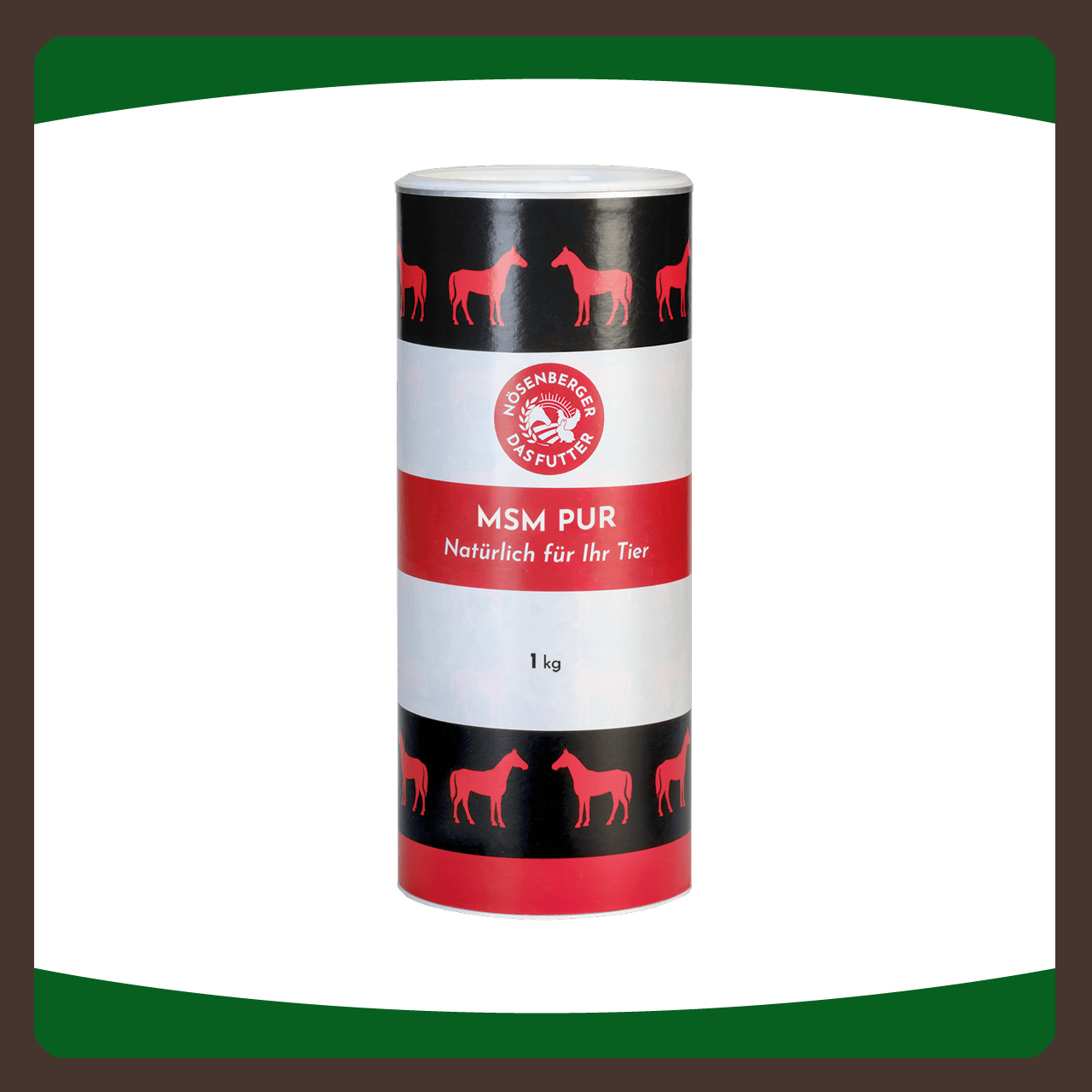 Nösenberger MSM Pur is an organic sulphur compound that supports the musculoskeletal system (joints, tendons, ligaments) and the regeneration of the organism. MSM Pur strengthens the body's own defences and can improve both the structure and resistance of hooves, skin and hair.
