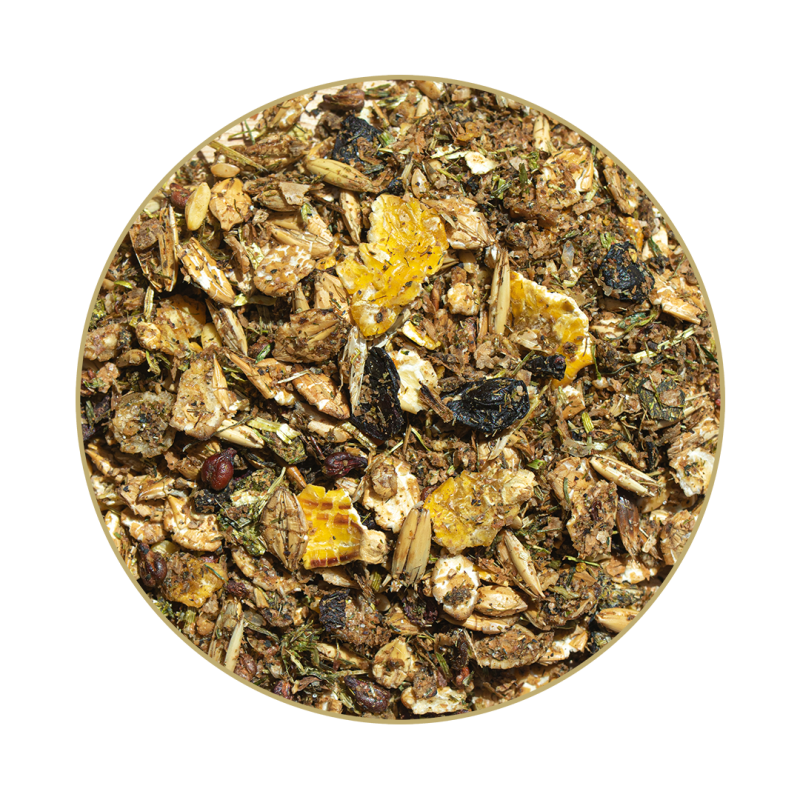 Wheat bran, barley flakes, oilseed mixture finely cracked (linseed, sunflower seeds) 9.2 %, wholemeal oat flakes 9 %, maize flakes, apple fibres, beet pulp, beet fibres, grass chaff hot air dried, Grape skins, apple syrup, brewer's yeast 1.4 %, salt, cold-pressed oil mixture (linseed, sunflower, maize germ oil) 1 %, maize germ, coriander, apple cider vinegar, calcium carbonate, malt-yeast seasoning 1 %, grape seed extract