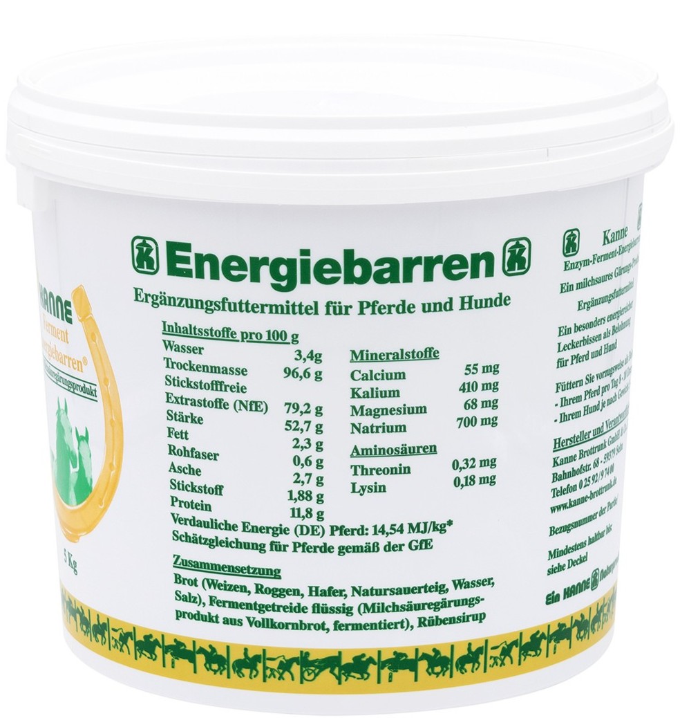 A Kanne Energy Bars® egy különleges, energiadús jutalomfalat kedvencének. Minőségi termék, és hagyományos módon, kemencében sütik. A Kanne Energy Bars® kiváló energiaforrás és ízletes jutalom egyszerre. A Kanne Energy Bars® mentes a szintetikus adalékanyagoktól és tartósítószerektől. A Kanne Organic Fermented Grain® folyadék állatoknak történő hozzáadásával ez a termék természetes tejsavat és más értékes összetevőket is tartalmaz. A Kanne Energy Bars® ezért könnyen emészthető.