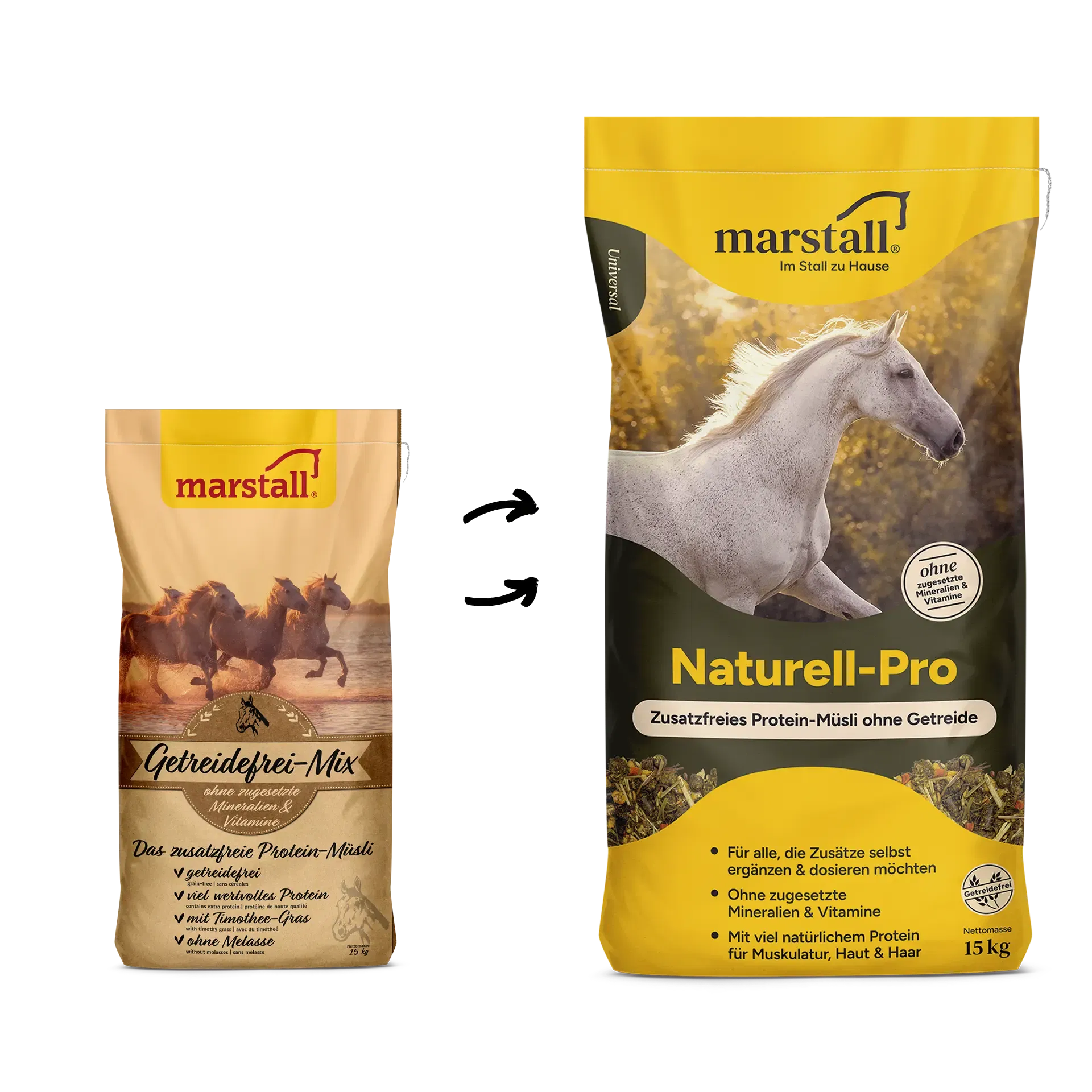 A Marstall Naturell-Pro a természetes, gabona nélküli fehérjekiegészítő az izomfenntartáshoz. A természetes müzli kizárólag őshonos tápanyagokat és rengeteg rágást elősegítő rostot tartalmaz puha Timothy fű és szénapellet formájában. Bármilyen más takarmányokkal kombinálható, mivel nem adnak hozzá ásványi anyagokat, nyomelemeket vagy vitaminokat. A fehérjében gazdag receptúra emellett nem tartalmaz sem melaszt, sem lucernát.