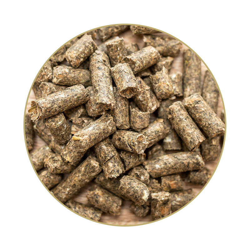 Őrölt lucerna rost, zabhéj korpa, búzakorpa, árpapehely (laktofermentált), palatinóz (β-glükóz), őrölt napraforgómag, tört lenmag, kalcium-karbonát, só, alma balzsamecet.