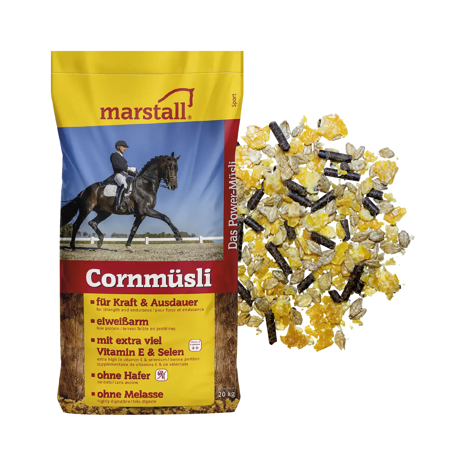 Marstall Cornmüsli liefert Pferden in allen Sportdisziplinen die nötige Energie. Die Kombination aus 80 Prozent leicht verdaulichen Getreideflocken, Omega-3-Pflanzenöl, Lecithin, Vitamin E und Selen ermöglicht eine moderate Kraftfuttergabe auch bei intensiver Arbeit.