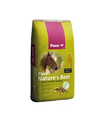Pavo Nature’s Best ist ein schmackhaftes, strukturreiches Müsli mit wenig Zucker und Stärke. Es besteht aus einer gesunden Basis aus Dinkel, Luzerne und Timotheegras. Timotheegras ist eine Grassorte mit wenig Fruktan (Zucker), die sehr nahrhaft für Pferde ist. Durch die gesunden Ballaststoffe ist Pavo Nature’s Best besonders gut verdaulich. Außerdem sorgen diese dafür, dass die Pferde besonders lang darauf kauen. Dadurch wird mehr Speichel produziert, was sich positiv auf die Darmtätigkeit auswirkt.