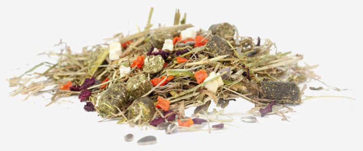 Lucerna, trava, zelena ječmenova slama, glicerin, posušeni radič, korenčkovi kosmiči, kosmiči rdeče pese, posušeni koščki jabolk, laneno olje, sončnično seme, kvasne kulture, kalcijev butirat, magnezijev oksid
