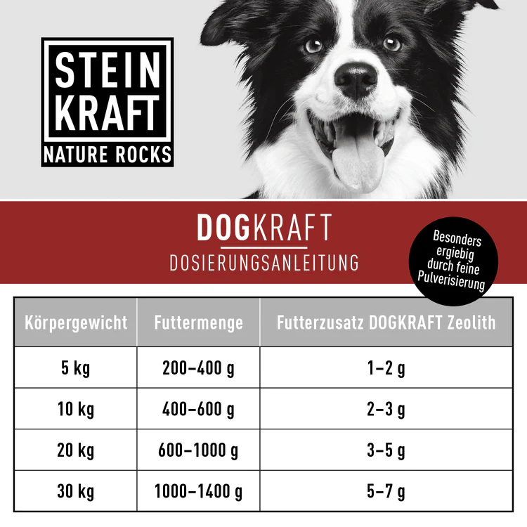 DOGKRAFT Zeolit v prahu za pse je naravni, fino zmleti mineral, ki ga lastniki psov uporabljajo že vrsto let - še posebej takrat, ko organizem potrebuje dodatno razbremenitev.