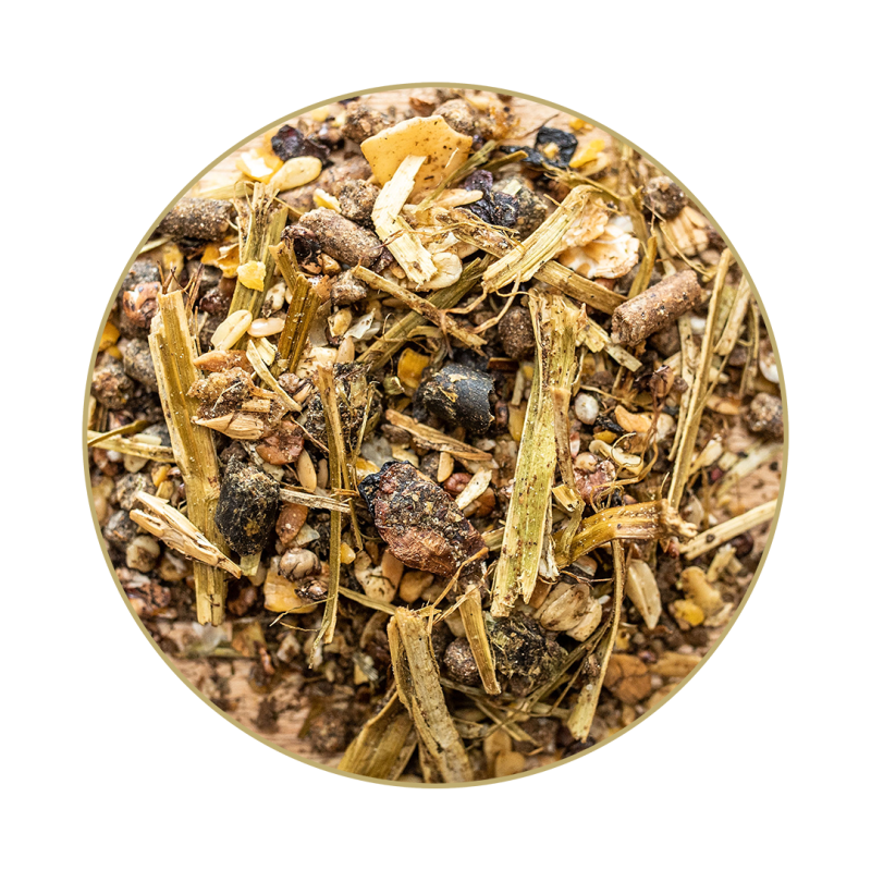 Hirseflocken, Luzernehäcksel, Rübenfasern, Maiskeime, Gerstenflocken, Palatinose (β-gluc.), Maisflocken, Lein-/Sonnenblumenölmischung kalt gepresst, Ölsaatenmischung (Leinsamen, Sonnenblumen, Schwarzkümmel), Bierhefe, Reiskeime, Apfeltrester, Weizenkleie, Calciumcarbonat, Salz, Seealgenmehl, Apfelbalsamessig