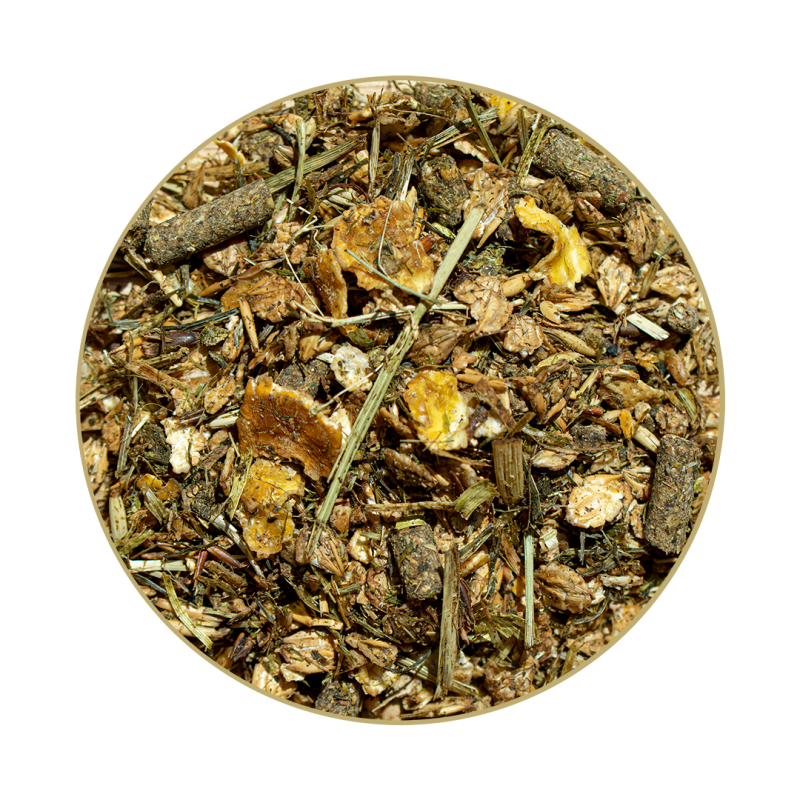 Gerstenflocken, Maiskeime, Luzernehäcksel, Haferschälkleie, Gerstenkeime, Ölsaatenmischung (Leinsamen, Sonnenblumenkerne, Fenchelsamen, Schwarzkümmelsamen) 6,6 %, Weizenkleie, Rübenfasern, Apfelfasern, Maisflocken, Kräuter (Pfefferminze, Koriander, Hibiskus, Anissamen) 2,8 %, Haferflocken 2 %, Apfelsirup, Grashäcksel warmluftgetrocknet, Seealgenmehl, Erbsenprotein, Salz, Calciumcarbonat (maritim und mineralisch), Ölmischung kaltgepresst (Lein-, Sonnenblumen-, Maiskeim-, Schwarzkümmelöl) 0,8 %, Bierhefe, Karotten, Dicalciumphosphat, Magnesiumacetat