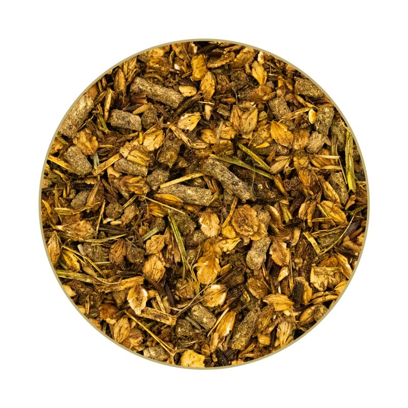 Gerstenflocken, Maisflocken, Rübenfasern, Vollkornhaferflocken 10 %, Rübenkraut, Luzernehäcksel, Ölsaatenmischung (Leinsamen, Sonnenblumenkerne) 5 %, Sojaflocken hydrothermisch aufgeschlossen, Ölmischung kaltgepresst (Lein-, Sonnenblumen-, Maiskeimöl) 3 %, Apfelfasern, Weizenkleie, Maiskeime, Apfelsirup, Grashäcksel warmluftgetrocknet, Himalayasalz, Weizenkeime, Calciumcarbonat (maritim und mineralisch), Seealgenmehl, Bierhefe, Obstessig