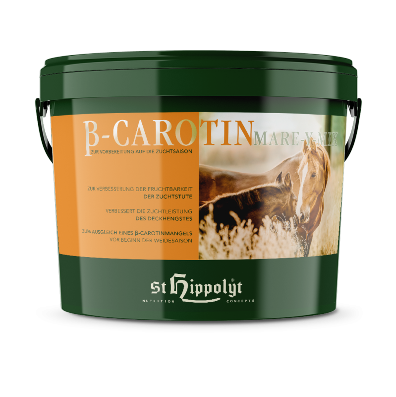 St. Hippolyt Beta-Carotin Mare-Y-Mix trägt zur Verbesserung der Fruchtbarkeit der Zuchtstute und der Zuchtleistung des Deckhengstes bei. Zu Fruchtbarkeitsproblemen kann ein oft in den Wintermonaten auftretender Mangel an Beta-Carotin bei Zuchtstuten und Hengsten führen. Mögliche Folgen können schlechtes Deckverhalten, verminderte Samenqualität, verzögerter Eisprung oder eine niedrige Befruchtungsrate sein. Während der Entwicklung des Embryos ist ein erhöhter Bedarf an Beta-Carotin vorhanden. Beta-Carotin Mare-Y-Mix wird hat vor allem in der Winterfütterung von Zuchtpferden überzeugt.