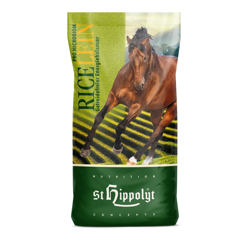 St. Hippolyt RiceLein ist ein getreidefreier, niederglykämischer Energiebalancer für Pferde mit Verdauungsbeschwerden, Muskelproblemen oder Stoffwechselerkrankungen. RiceLein dient als Aufwertung energiearmer Rationen und eignet sich als Kombination zu jedem Basisfutter. Schnell verfügbare Energie wird anstatt von Stärkequellen durch leicht fermentierbare Fasern und Reiskeimöle bereitgestellt. RiceLein ist auch für magenempfindliche Pferde durch die enthaltene, magenschützende Leinsaat geeignet. Aufgrund des niedrigen Zucker- und Stärkegehalts profitieren ebenso Pferde mit Muskelproblemen wie PSSM, Tying Up und Kreuzverschlag sowie Pferde mit PPID (Equinem Cushing Syndrom) von diesem Produkt.