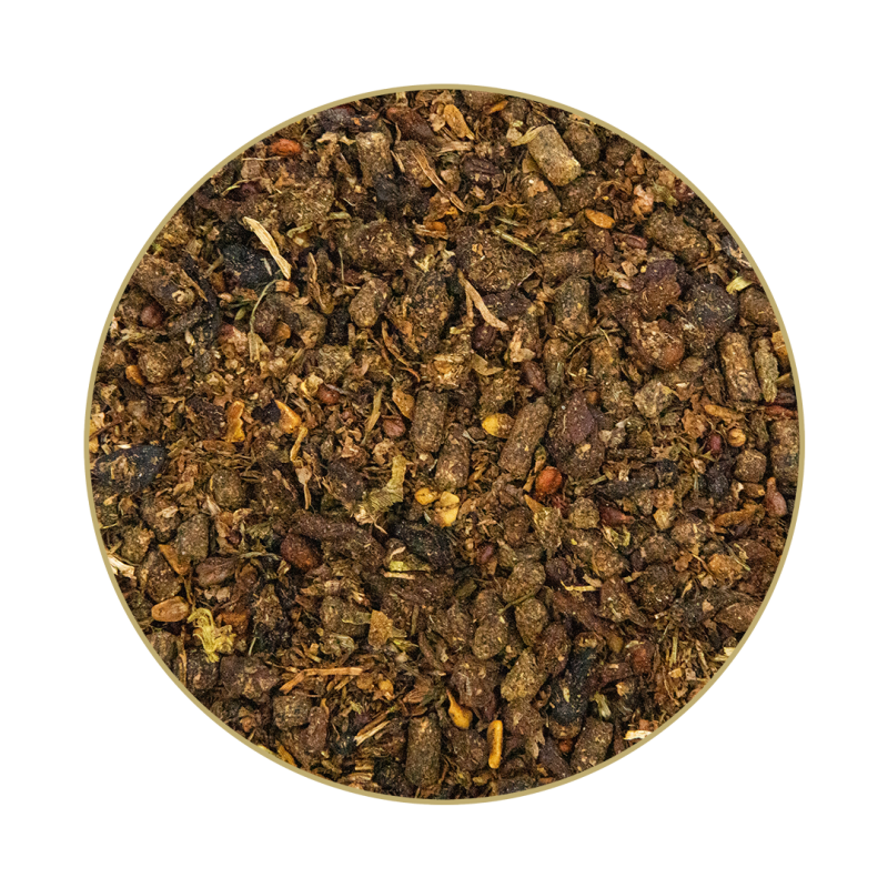 Obstfasern (Apfel, Traube), Grashäcksel warmluftgetrocknet, Calciumcarbonat (maritim und mineralisch), Rübenkraut, Apfelsirup, Ölmischung kaltgepresst (Lein-, Sonnenblumenöl) 4 %, Kräuter (Koriander, Pfefferminze, Fenchel, Mariendistelsamen, Majoran, Kurkuma, Kornblumenblüten) 3 %, Ölsaatenmischung fein gecrackt (Leinsamen, Sonnenblumenkerne) 2,2 %, Salz, Rübenfasern, Sojaflocken hydrothermisch aufgeschlossen, Erbsenflocken, Seealgenmehl, Magnesiumacetat, Bierhefe, Karotten, Knoblauch
