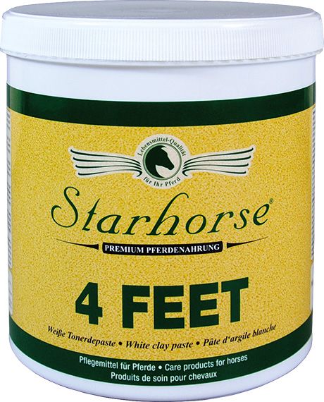 Starhorse 4-Feet ist eine Weiße Tonerdepaste, die bei überbeanspruchten Sehnen, Bändern, Gelenken und Muskeln angewendet werden kann. Die Regenerationszeit kann sich bei der Verwendung von 4-Feet durch die pflegenden Eigenschaften verkürzen. Selbst bei sehr starker Belastung kann die Pflegepaste bestens unterstützen. Als Wärme- und Kältepackung geeignet (siehe Anwendung). Starhorse 4-Feet ist leicht mit Wasser abwaschbar.