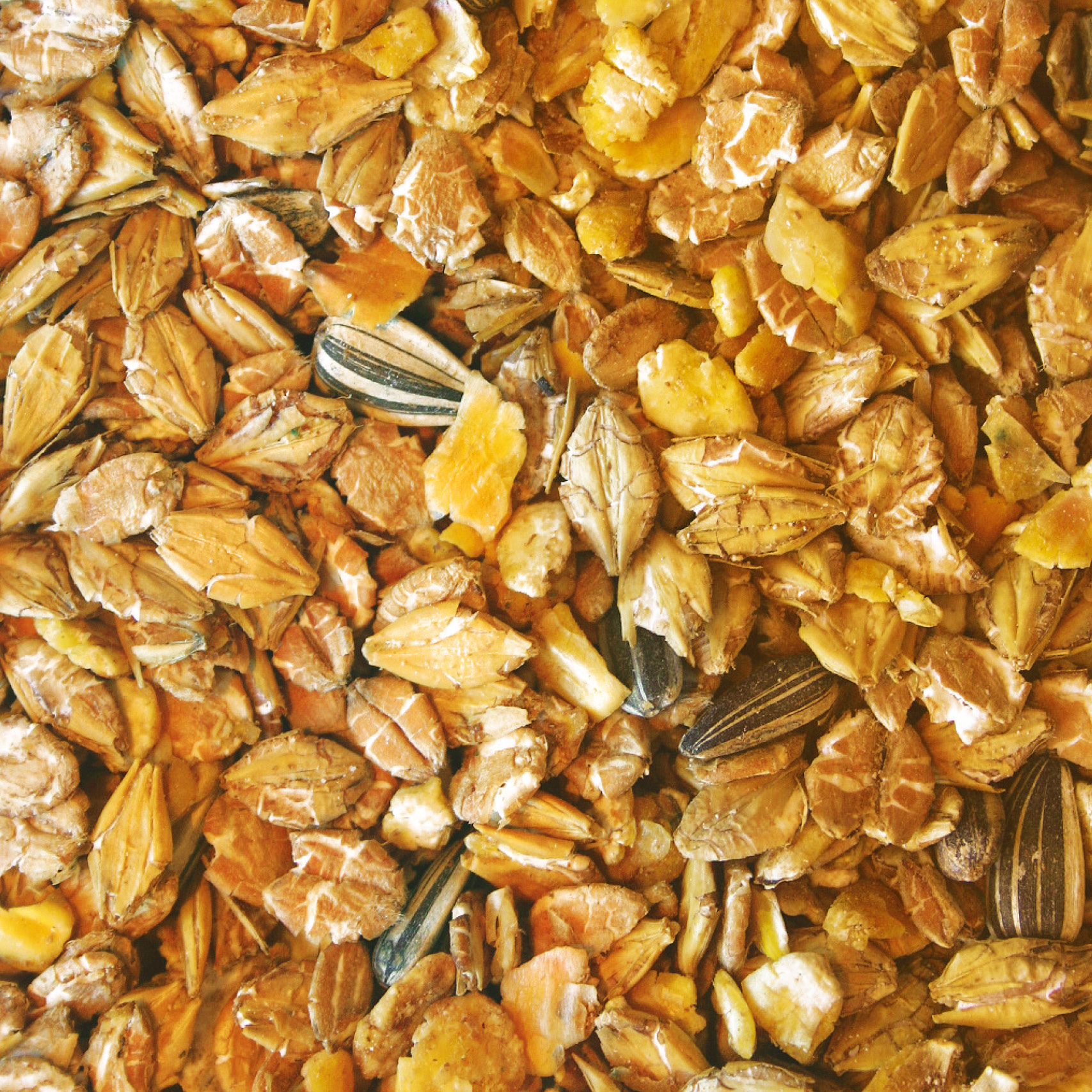 Mais (Maisflocken), Gerste (Gerstenflocken), Sonnenblumenkerne, Zuckerrübenmelasse, Calciumcarbonat, Monocalciumphosphat, Natriumchlorid, Natriumbicarbonat, Weizenkleie, Magnesiumoxid
