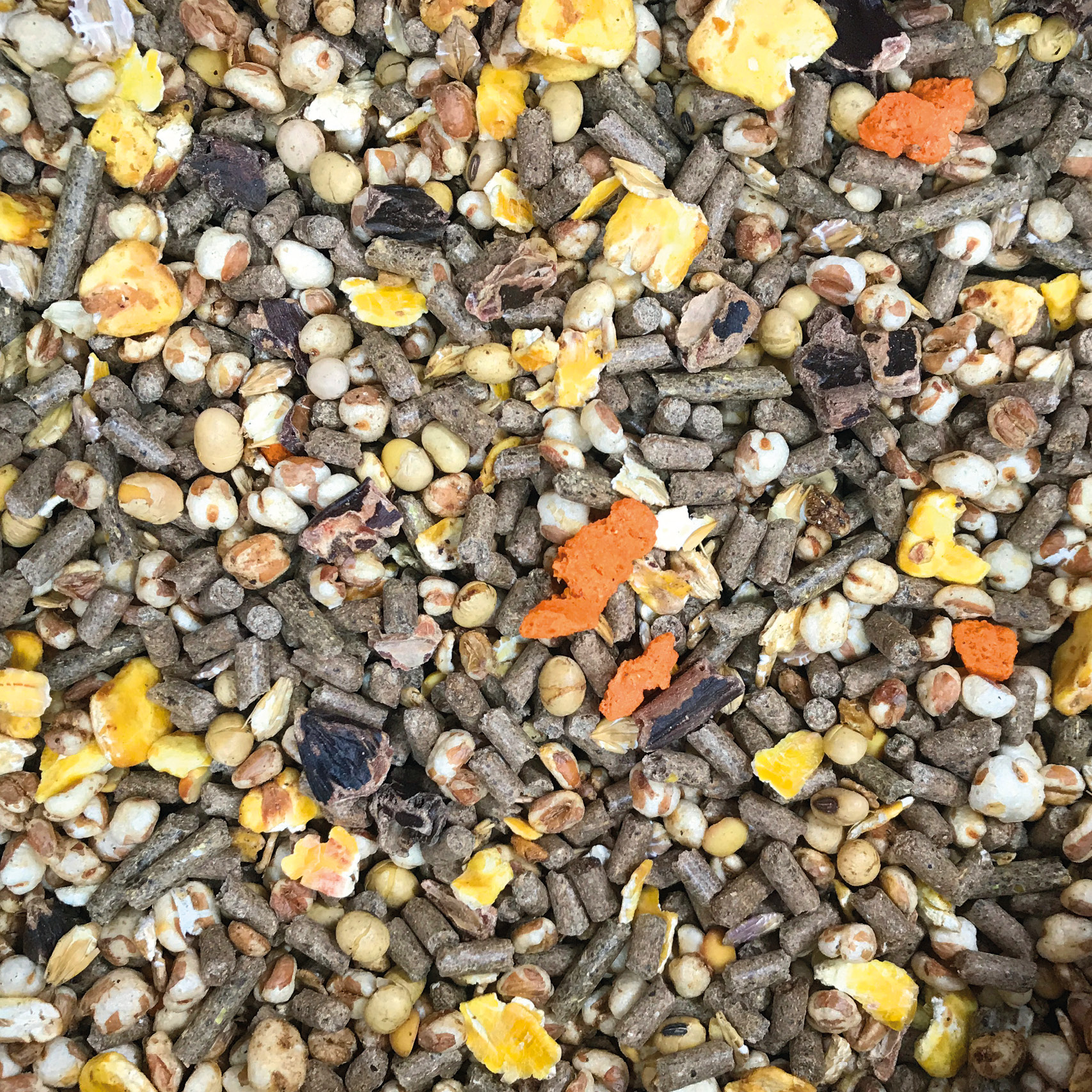 Weizenkleie, Weizen (Weizen, gepoppt), Mais (Mais, gepoppt, Maisflocken), Sojabohnen thermisch behandelt, Zuckerrübentrockenschnitzel melassiert, Gerste (Gerstenflocken), Zuckerrübenmelasse, Johannisbrotschrot, Leinkuchen, Grashäcksel warmluftgetrocknet, Lignocellulose, Calciumcarbonat, Maiskeime, Mais, Natriumchlorid, Natriumbicarbonat, Magnesiumoxid, Monocalciumphosphat
